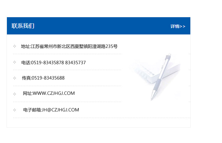 地址:常州市新北區友邦商務大廈1幢16、17層  電話:0519-85101652  傳真:0519-85112595  郵編:213022  網址:www.cz-jiayue_cn.eyachi.com  郵箱:xiajifengaa@163.com